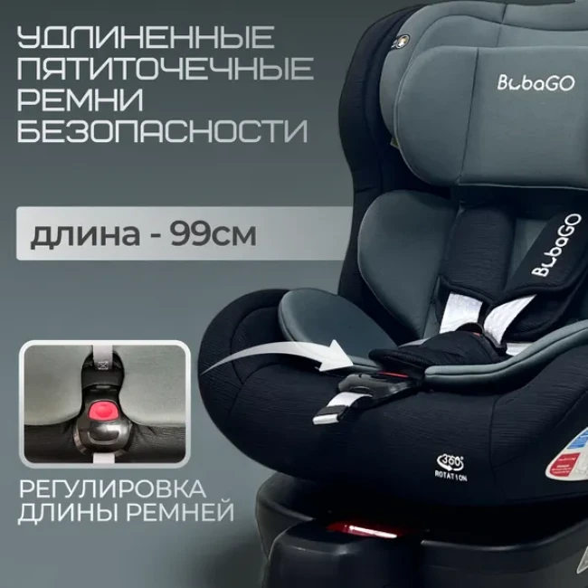- Пятиточечные ремни безопасности регулируются по высоте, оснащены мягкими антискользящими накладками и имеют увеличенную длину — 99 см, что обеспечивает более комфортную фиксацию ребёнка.