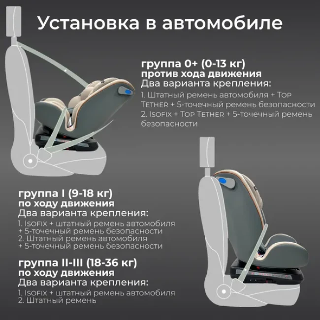 - Комбинированная система крепления Isofix + Top Tether исключает неправильную установку и обеспечивает жёсткую фиксацию кресла в автомобиле.