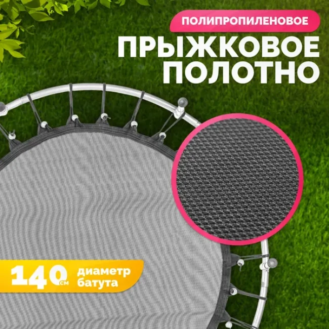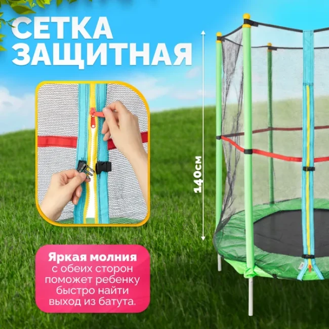 Продуманная конструкция с защитной сеткой повышает безопасность, предотвращая падения во время прыжков. Высота батута составляет 30 см, а с защитной сеткой — 170 см, что обеспечивает достаточное пространство для игр. Диаметр батута — 140 см, идеальный размер для размещения в саду или на заднем дворе.