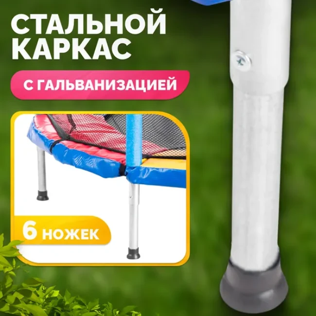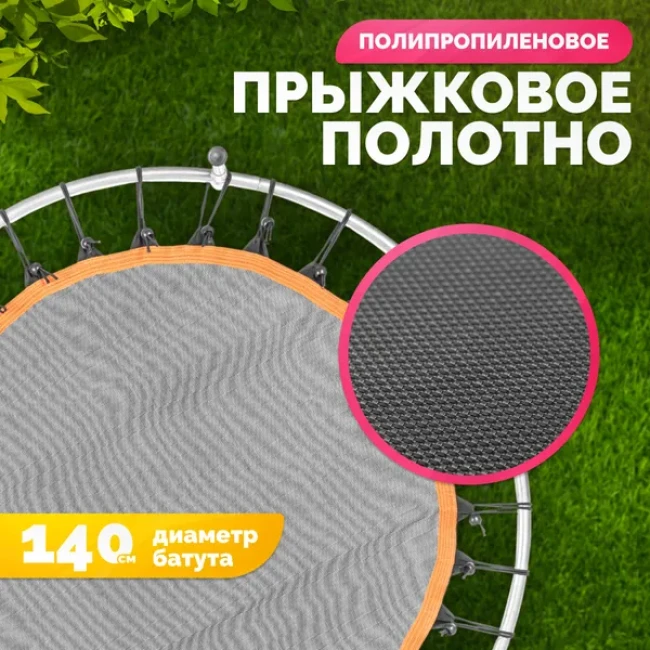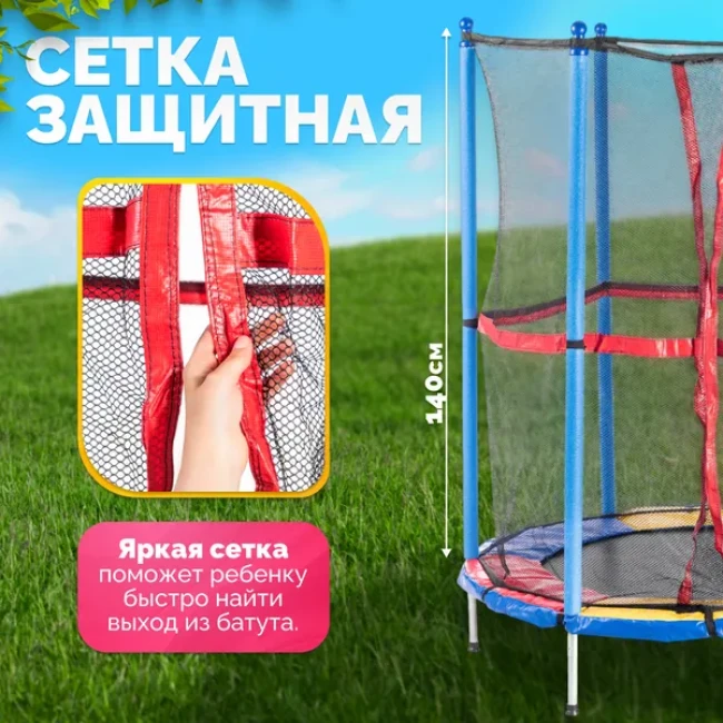 Продуманная конструкция с защитной сеткой повышает безопасность, предотвращая падения во время прыжков. Высота батута составляет 30 см, а с защитной сеткой — 170 см, что обеспечивает достаточное пространство для игр. Диаметр батута — 140 см, идеальный размер для размещения в саду или на заднем дворе.