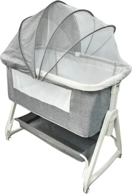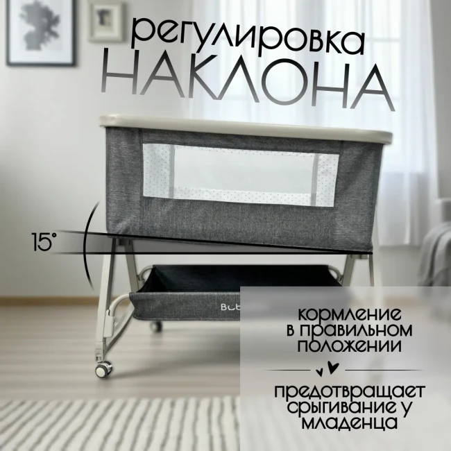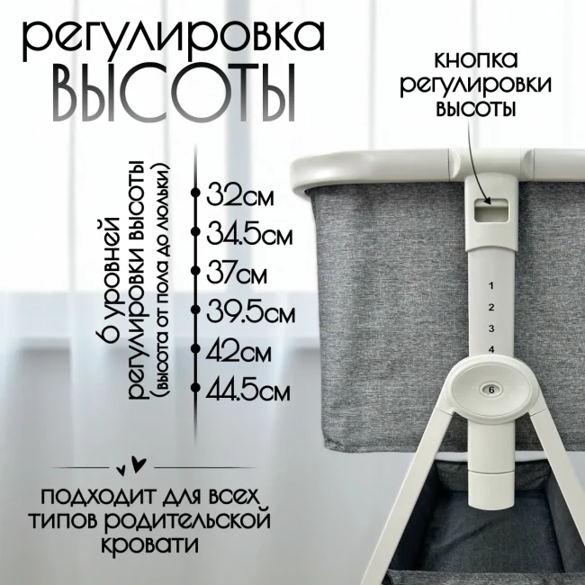 Функция приставной кроватки обеспечивает удобное ночное кормление и спокойный совместный сон, когда ребёнок всегда рядом с родительской кроватью. Универсальная система крепления подходит для всех типов кроватей, а шесть режимов регулировки высоты позволяют точно подстроить положение люльки.