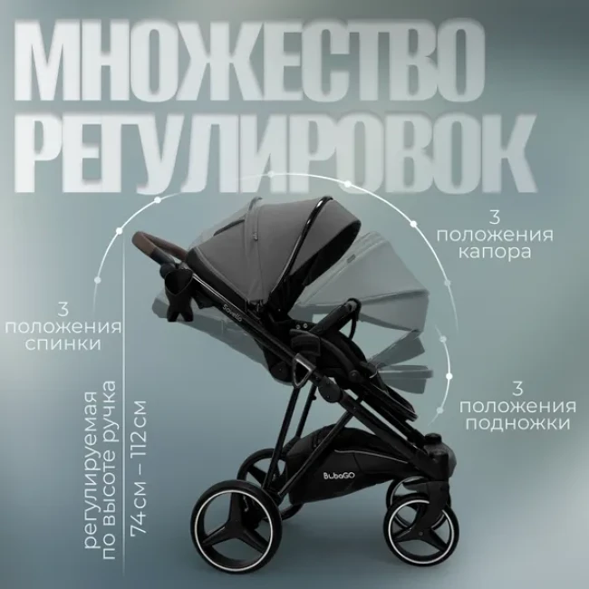- Регулируемая пружинная амортизация с двумя режимами жёсткости позволяет адаптировать коляску под разные дороги и стиль прогулок;