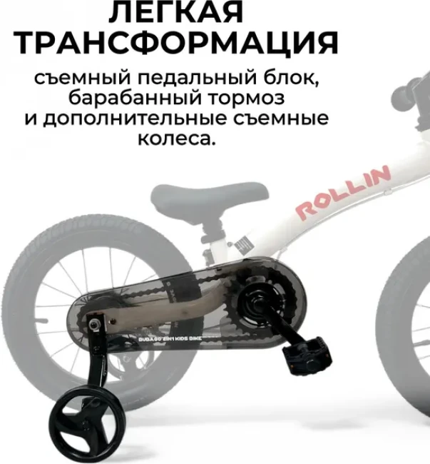 Для обеспечения комфортного передвижения по дорогам, модель оснащена дополнительными боковыми колесами, крепящимися к заднему колесу. Это особенно важно для детей, которые только начинают осваивать владение двухколесным велосипедом и еще не умеют держать равновесие на велосипеде. При использовании модели в качестве беговела, дополнительные колеса быстро и легко демонтируются вместе с педальным блоком и цепью. Тормозная система велосипеда-беговела Rollin представлена надежным ручным барабанным тормозом на заднее колесо.