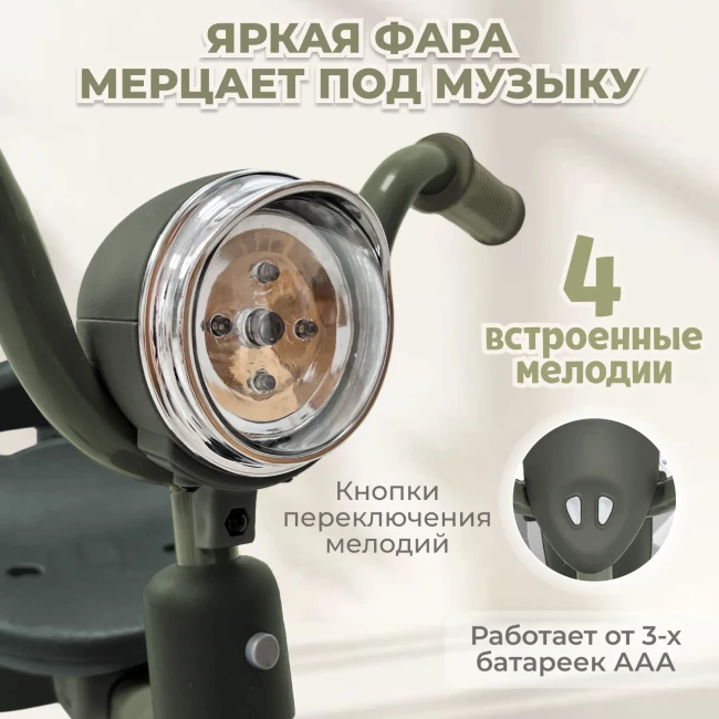 Яркая музыкальная фара со световыми эффектами и 4 мелодиями делает поездки еще интереснее и превращает велосипед в любимый транспорт ребенка. Необходимо 3 батарейки AAA (не входят в комплект).