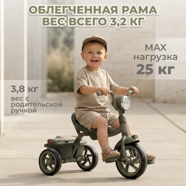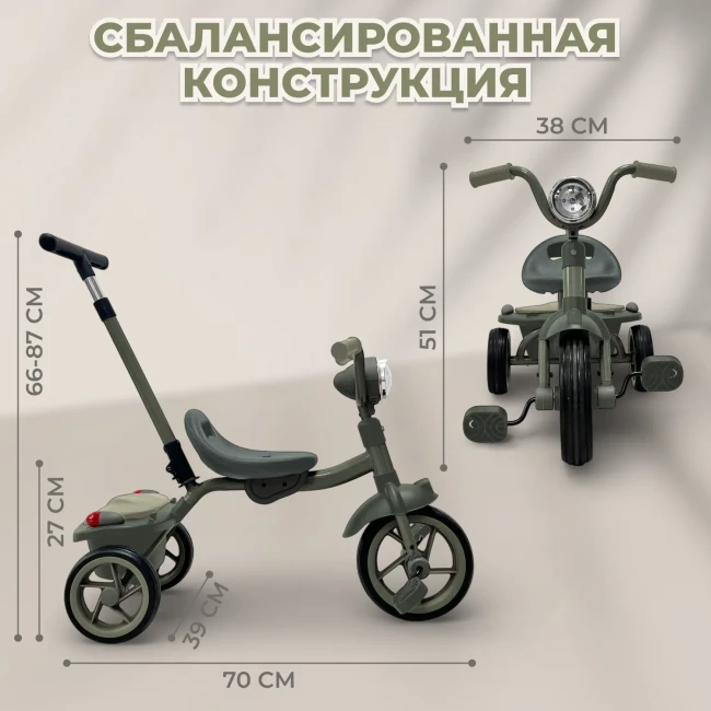 В комплект входит съемная родительская ручка с регулировкой по высоте (66–87 см). Она помогает поддерживать ребёнка на первых этапах обучения, а когда малыш станет увереннее — ручку можно полностью снять.