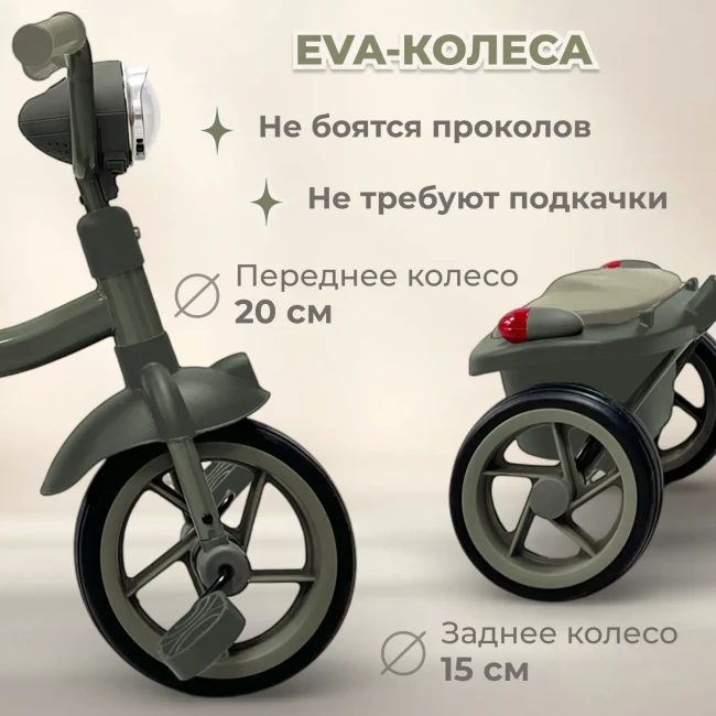 Мягкие EVA-колеса едут плавно и тихо, не боятся влаги и проколов, легко справляются с неровностями дорожек и делают прогулки комфортными.