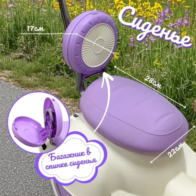- Сиденье: комфортное широкое устойчивое сиденье с удобной спинкой (багажник внутри).