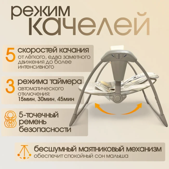 - Бесшумная работа — качание не тревожит ребёнка и не мешает сну.
