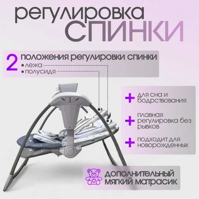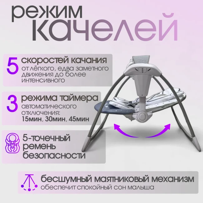 Качание происходит плавно и равномерно — без рывков и лишней вибрации, что особенно важно для новорождённого.