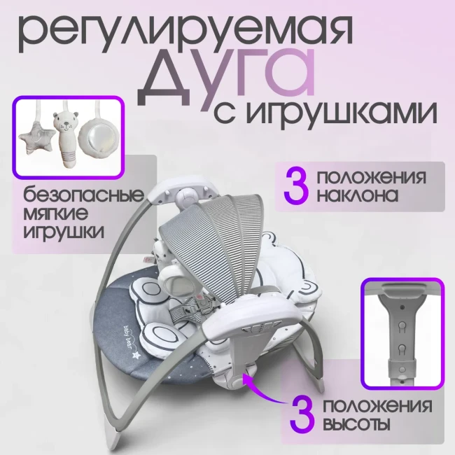 - Съёмная дуга с игрушками регулируется по высоте в трёх положениях. Мягкие игрушки развлекают малыша, стимулируют зрительное восприятие и координацию движений.