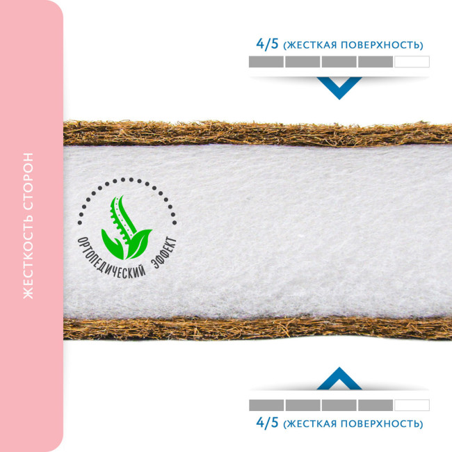 Кокосовое полотно, расположенное с двух стороны матраса, наилучшим образом подойдет для детей, ведь их формирующийся позвоночник нуждается в правильной поддержке во время сна. Гипоаллергенное полиэфирное волокно, которым скреплены кокосовые нити обеспечивает воздушные карманы, чем поддерживается оптимальная циркуляция воздуха, такая же, как и в плите Холлофайбера. Такое сочетание делает матрас подходящим для детей с аллергией на латекс, т.к. он не используется в данной технологии производства наполнителей.