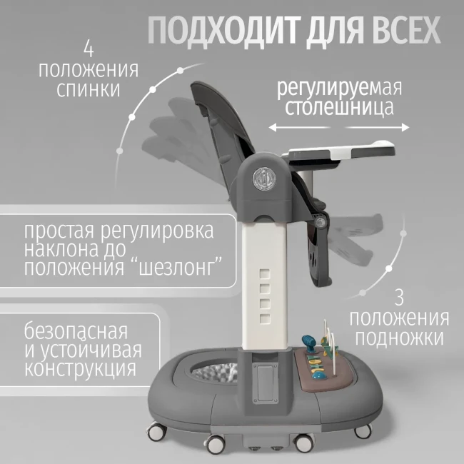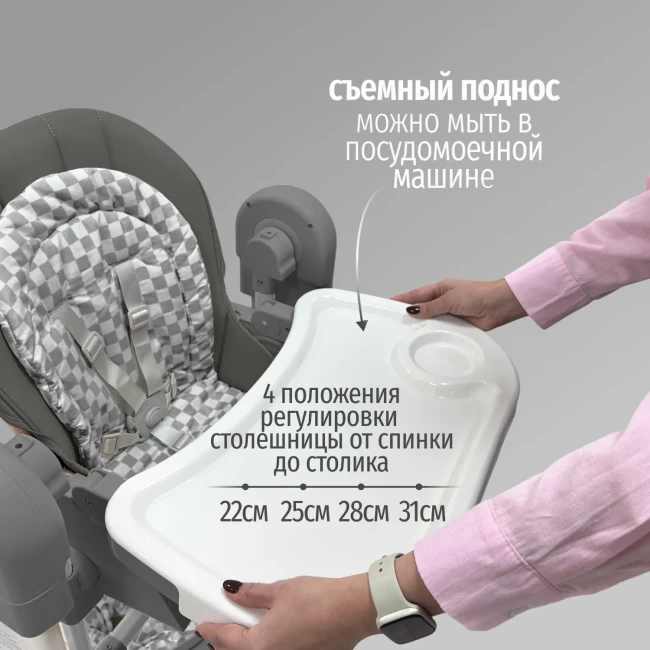Съёмный столик и регулируемая спинка — комфорт в любом возрасте.