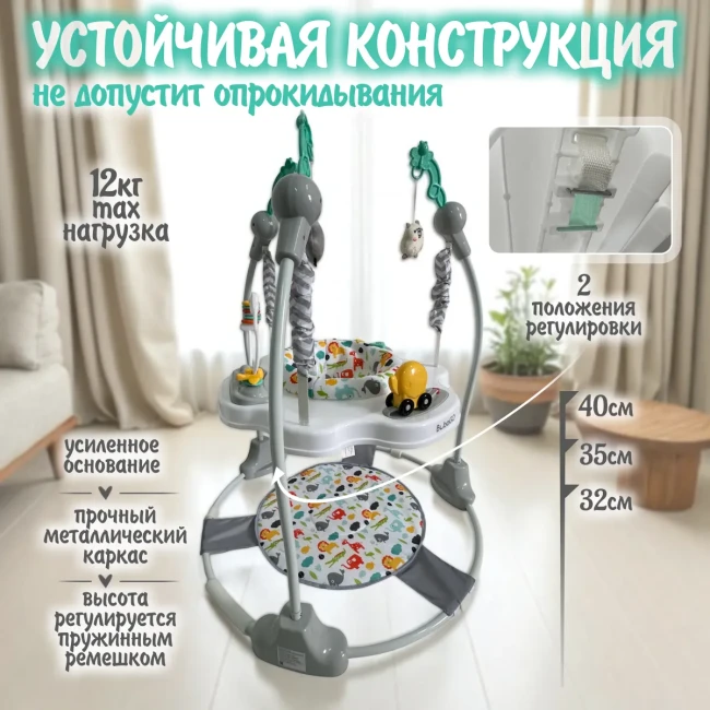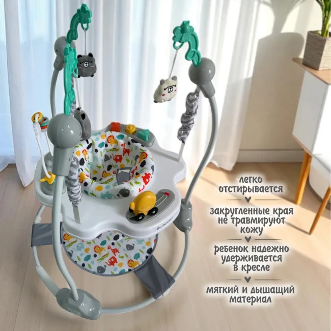 Прыгунки помогают малышу выплеснуть энергию, тренируют мышцы ног и спины, развивают чувство равновесия и координацию движений. В игровой зоне ребенка ждут подвесные и стационарные игрушки, а также музыкальная панель, расположенные по кругу. Они стимулируют слух, зрение и моторику, а благодаря вращающемуся на 360° сиденью малыш всегда найдет что-то интересное и не заскучает.